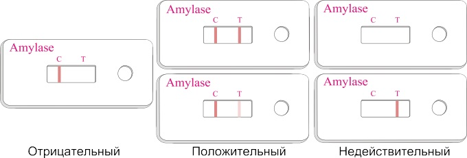 После 10 минут тестирования в окне результата появятся полоски: при присутствии альфа-амилазы в пробе видны две полоски, при отсутствии альфа-амилазы в пробе видна одна полоска.