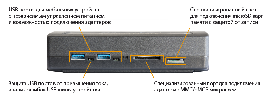 Форм фактор: Внешнее устройство Тип интерфейса: USB3.0 Порты для подключения накопителей: 2 х USB 3.0 (HUB), 1 x USB 3.0 (Адаптер), Порт eMMC (SD/eMMC/eMCP), Порт SD/microSD (SD/eMMC/eMCP/microSD) Адаптер питания: 4-канальный, независимый, с защитой от перегрузок Блок питания: Внешний AC/DC 19 В Дополнительно: переключатели защиты от записи для SD/MMC Портов
