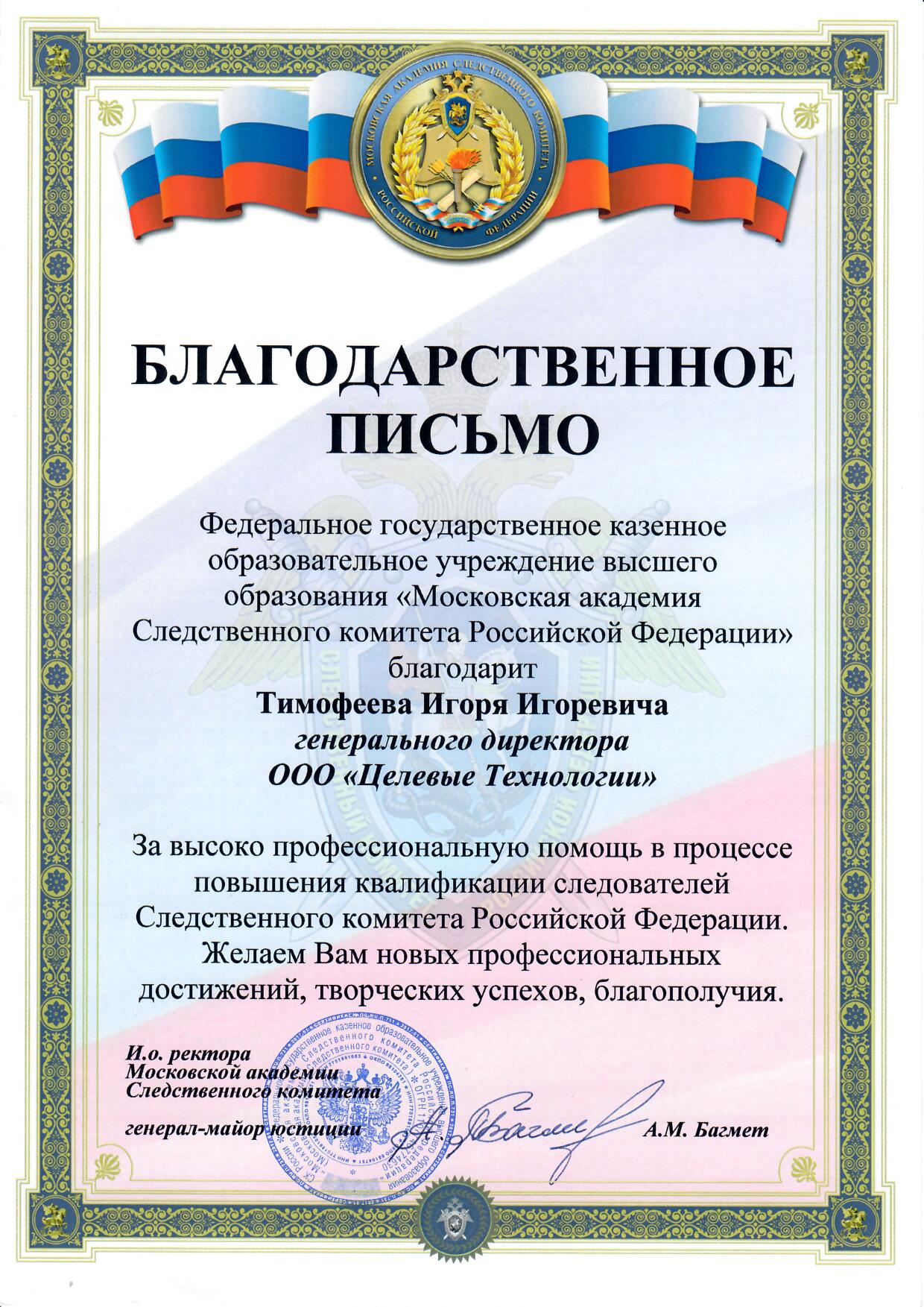 Руководство Московской академии Следственного комитета Российской Федерации объявило благодарность компании ООО "Целевые Технологии" за высоко профессиональную помощь в процессе повышения квалификации следователей Следственного комитета Российской Федерации.