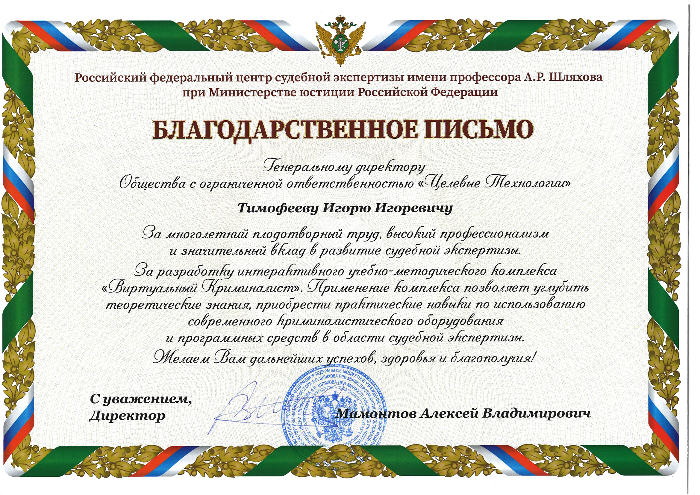 9 февраля 2026 г. (г. Москва) - компания получила благодарственное письмо от РФЦСЭ при Минюсте РФ за разработку учебно-методического комплекса "Виртуальный Криминалист".