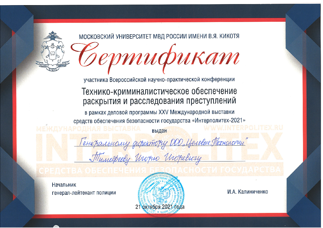 21 октября 2021 г. (Москва) - компания приняла участие во Всероссийской научно-практической конференции "Технико-криминалистическое обеспечение раскрытия и расследования преступлений" в рамках деловой программы XXV Международной выставки средств обеспечения безопасности государтсва "Интерполитех-2021". Организатор - Московский Университет МВД России имени В.Я. Кикотя.